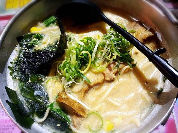 雖然沒有蛋,可是海帶芽豆芽菜、玉米、筍乾等配菜是完全不吝嗇大把地給,也有附上一片海苔。讓你吃麵不至於太單調,很多東西可以咬,口感豐富許多...。