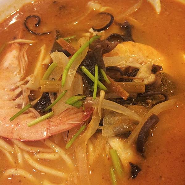 吃過泰國的MAMA泡麵嗎?味道就像是MAMA泡麵,但是沒有MAMA那麼濃重的酸辣。整碗麵吃起來酸辣但是不會覺得嗆,湯頭溫潤順口喝完也不會覺得胃痛,還有淡淡的香茅味,筍片木耳爽脆口感配上麵條一口接一口的很過癮,麵條普通不特別Q彈,
