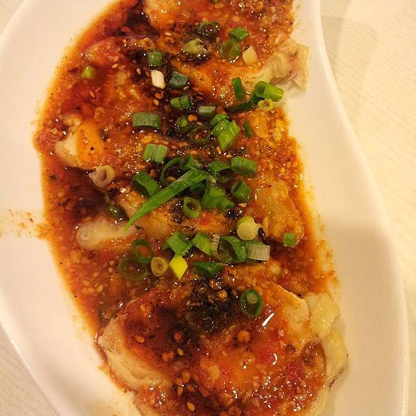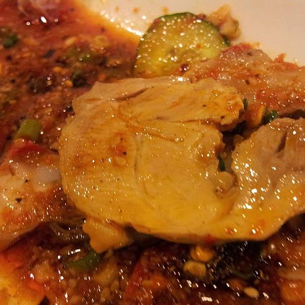 雲南菜的特色就是善用各種藥草香料,這道麻辣雞,被紅通通像花椒油的醬汁覆蓋,看起來也有滿滿貌似辛辣的香料,吃起來卻只有一點麻,不會很辣唷。怕辣的人也可以吃,入口還有點酸酸檸檬汁的香氣,夏天吃非常爽口開胃。雞肉本身肉質鮮嫩,口感就像是海南雞飯的雞肉那樣軟嫩,雞肉吃起來並沒有特別的入味,沾裹著醬汁一起吃很OK的,缺點是因為平價的關係,份量有點少,大約五六片雞肉片,比一份油雞腿的份量還少,算是精緻路線,吃巧不吃飽。