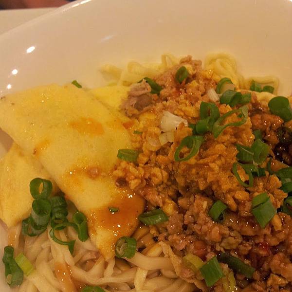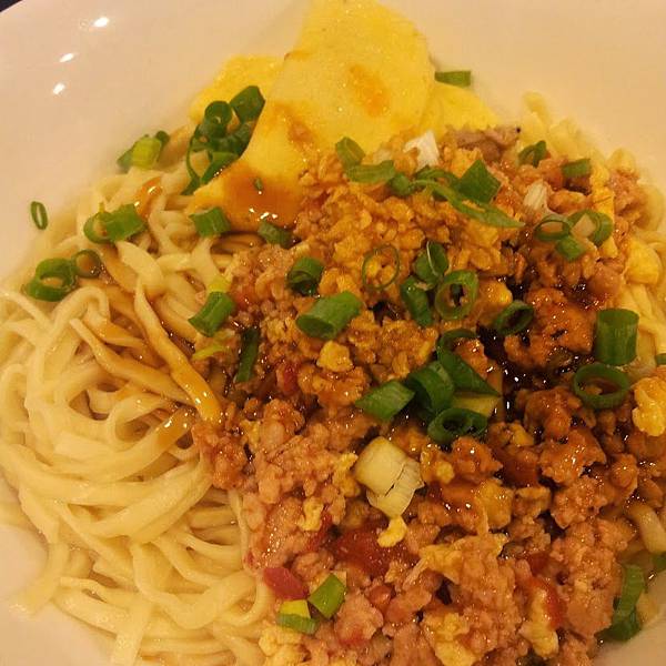 哨子乾麵,先說說麵條,麵條是一般的白麵,有點寬度,不是細麵,炒的鹹香入味的絞肉跟番茄丁炒蛋製成的澆頭,鋪得滿滿的,在撒上蔥花,上頭還淋了店家自己調的醬汁吧,吃起來酸鹹甜口感豐富。,印象中還有吃到花生粒? 哨子麵依照店家喜好有的會加入豆乾丁洋蔥丁或是四季豆丁等做搭配,不過雲南婆婆蠻特別的,可能怕只有麵加絞肉看起來太空虛,還附上兩粒蛋餃。