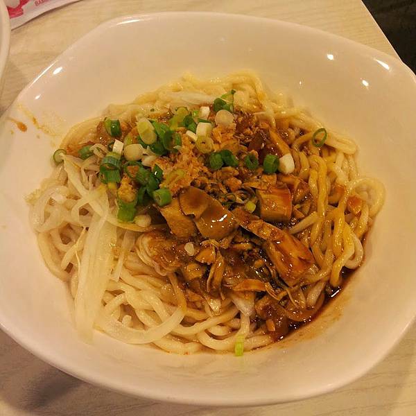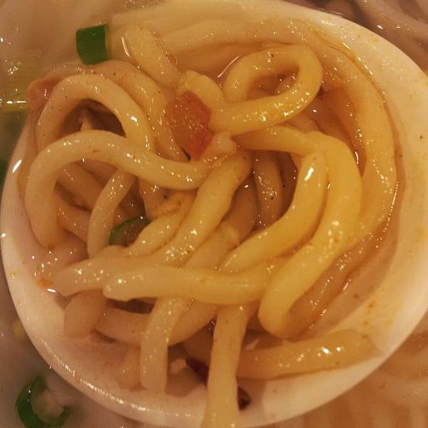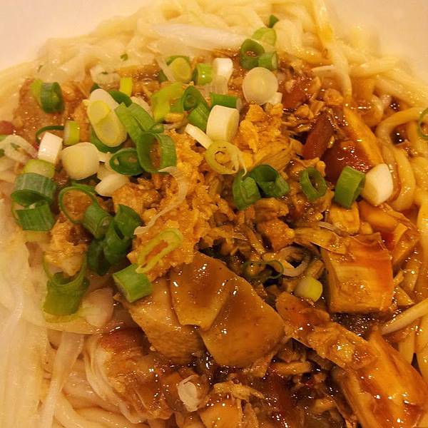 嚴格說起來沒有甚麼濃郁咖哩味,澆頭應該跟上面的哨子乾麵是出自同一鍋,因為配料大同小異,多了洋蔥和有咖哩味道的雞肉丁,吃起來就是淡淡的咖哩加上酸甜鹹,雞肉丁很嫩很好吃,這裡不太一樣的是麵條,