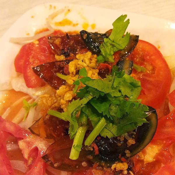 恩非常普通,大量的生洋蔥鋪在最底層依序是番茄片、皮蛋、酸辣的醬汁、香菜。